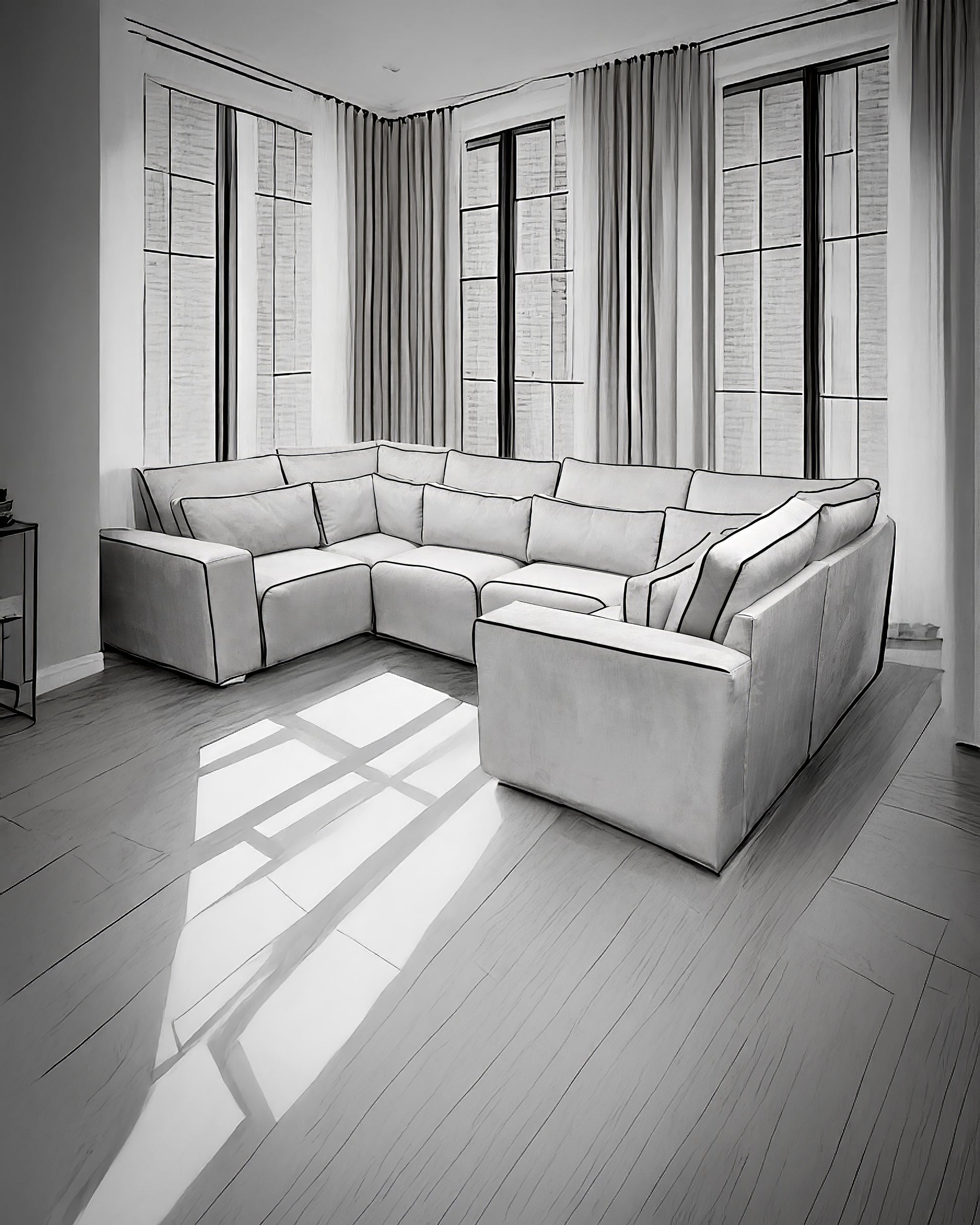 The Mayfair U-Shape Sofa With Black Piping Close End is designed to bring statement style and everyday comfort into your home. Upholstered in a soft neutral fabric, this spacious U-shape sofa is finished with bold black piping that defines its clean lines and adds a modern, designer touch.